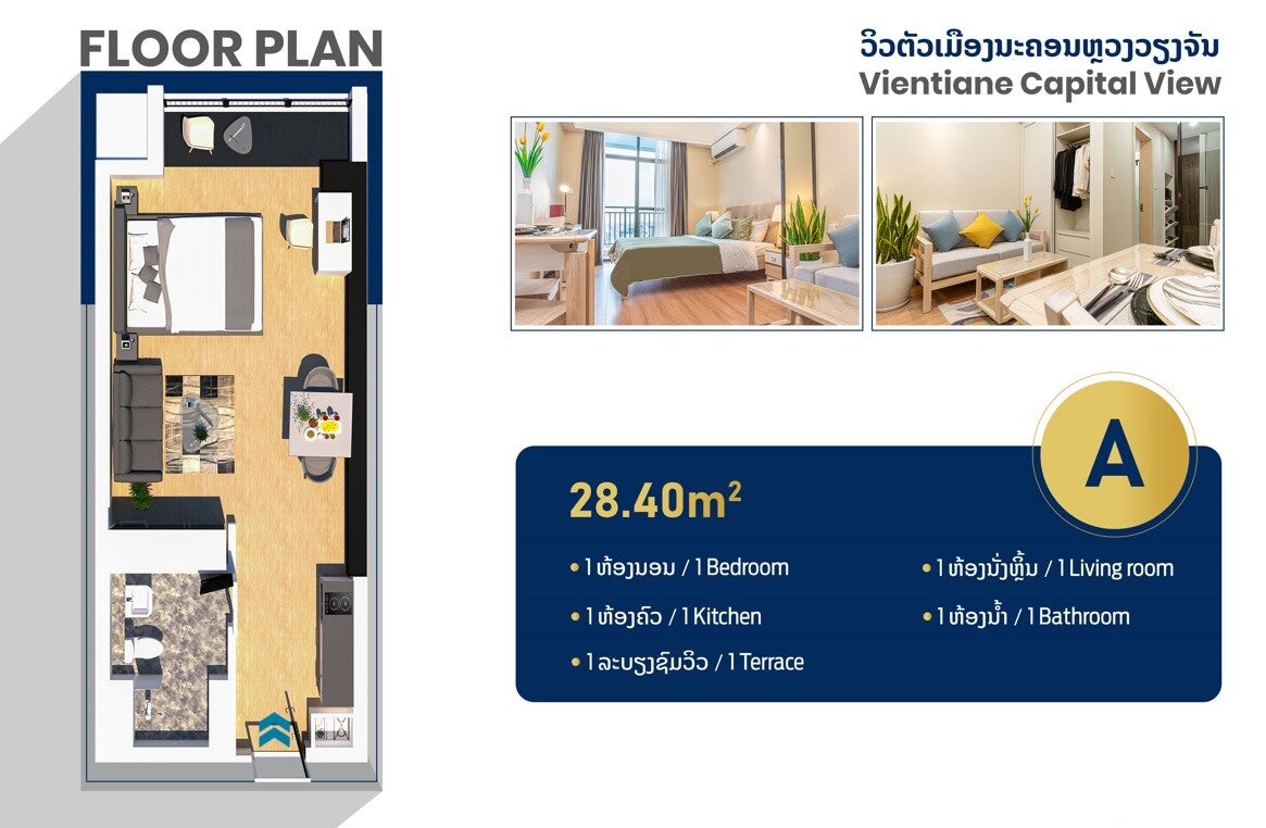 A new property development in the core center of Vientiane. It consists of a South tower with shopping mall and 5-star level hotel, and a North tower with residential condominiums. The condominiums are fully furnished and ready-to-move-in, currently available from 6th floor till 22nd floor with brilliant views.